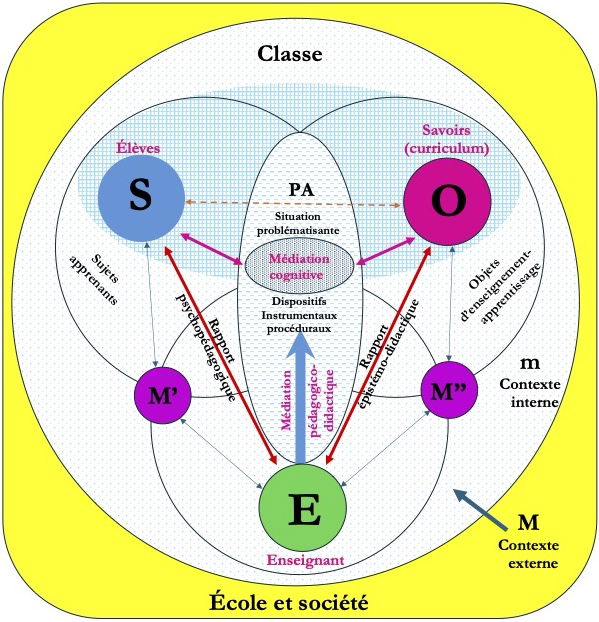 Tout d’abord, et c’est en cela que le cadre conceptuel qu’il conçoit se démarque radicalement, le Pr Lenoir a adopté le concept central et fondamental de médiation [9] (issu du courant hégélien et de la théorie critique de l’École de Frankfort et adapté des travaux de Freitag). À l’encontre de nombreuses recherches à caractère objectivistes et des visions simplistes du “triangle pédagogique” qui postule l’existence de liens directs entre les composantes de toute situation d’enseignement-apprentissage, le recours au concept de médiation met en évidence que tout rapport d’objectivation est toujours médiatisé par un autre terme. L’idée maîtresse qui soutient l’argumentaire de cette présentation réside dans le constat que toute appréhension du savoir (ou, plus généralement, toute connaissance) procède d’un rapport d’objectivation par lequel un sujet établit une distance (rend étranger à lui) un objet dont il doit ensuite surmonter la rupture établie par la biais d’une médiation qui peut être spontanée ou scientifique. De plus, au lieu de concevoir ce concept d’un point de vue uniquement instrumental, ce qui renvoie à des notions de conciliation, d’arbitrage, de négociation ou de résolution de conflits, il est approché d’un point de vue dialectique en étant centré sur les tensions, contradictions et conflits tant cognitifs que culturels que vivent les élèves dans leurs processus d’apprentissage et dans les rapports qu’ils tissent avec leur enseignant. En contexte scolaire, tout processus d’enseignement-apprentissage repose sur un système de médiations qui relève à la fois de l’élève et de l’enseignant dans leurs interactions. Si l’élève établit un rapport au savoir par le biais d’une médiation cognitive en recourant à des démarches d’apprentissage à caractère scientifique (démarches communicationnelle, de résolution de problèmes, conceptuelle, expérimentale, etc.), l’enseignant en tant qu’un intervenant (il vient entre, ce qui fait la spécificité du travail enseignant), se caractérise par l’action médiatrice qu’il porte sur la médiation cognitive de l’élève (les processus d’apprentissage mis en œuvre par l’élève), la médiation pédagogicodidactique [10], de manière à planifier, orienter, soutenir et évaluer les apprentissages (POSELA) des élèves. Cette médiation pédagogicodidactique est elle-même la résultante d’une double médiation : la première, à la fois didactique en ce qu’elle porte sur le traitement des savoirs disciplinaires à enseigner, extraits du curriculum, pour les rendre accessibles aux élèves, et épistémique en ce qu’elle caractérise la conception épistémologique du savoir de la part de l’enseignant (un donnée ou un construit) ; la seconde, psychopédagogique, porte d’une part, sur les dimensions pédagogiques, organisationnelles et affectives et, d’autre part, sur la reconnaissance réciproque de la dimension humaine des différents sujets (enseignant et élèves), reconnaissance qui est au fondement à la fois de l’acquisition de la confiance en soi, du respect de soi et de l’estime de soi, et du désir de savoir chez l’élève, la reconnaissance précédant la connaissance. Enfin, la rencontre entre la médiation cognitive de l’élève et la médiation pédagogicodidactique de l’enseignant qui soulève la question centrale du rapport au savoir dans le curriculum, s’actualise au sein de situations d’enseignement-apprentissage – des situations problématisantes qui deviendront des situations problèmes lorsque les élèves se les seront appropriées – et fait appel à divers dispositifs opératoires, instrumentaux (manuels [11], Internet, etc.) et procéduraux (facilitateurs pédagogiques, démarches, approche interdisciplinaire, projet, etc.) dans la perspective d’appréhender les pratiques dans leur dynamique évolutive hautement complexe avec pour objectif de favoriser une intégration des processus d’apprentissage et des savoirs chez des sujets apprenants [13].
