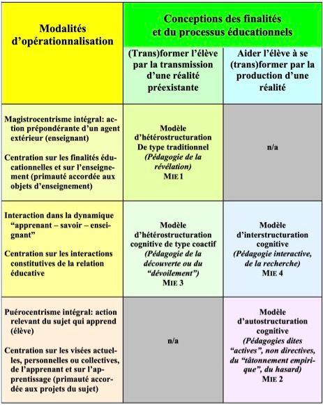 quatre postures épistémologiques caractérisant la conception et l’opérationnalisation de l’intervention éducative ont été dégagées et modélisées : l’hétérostructuration cognitive traditionnelle (qui renvoie à la contemplation ou à la révélation) ou coactive (qui renvoie au dévoilement), l’autostructuration (qui renvoie au laisser-faire, à la non-intervention), l’interstructuration (qui renvoie à des rapports intersubjectifs).