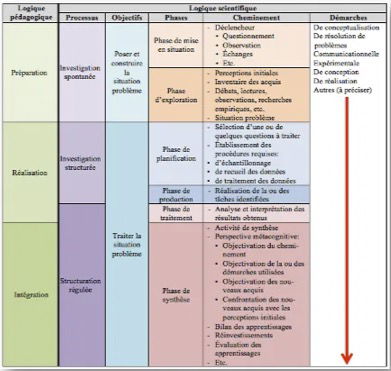 Alors que les conceptions dominantes dans le milieu scolaire ne font en fait que reprendre le discours ministériel qui articule la structuration d’une activité d’enseignement-apprentissage en trois temps pour – la préparation, la réalisation, l’intégration –, ne retenant ainsi que la logique pédagogique (un début, un milieu, une fin !), nous avons voulu montrer qu’elle n’était pas incompatible in se avec la logique didactique qui repose sur une structuration plus complexe et plus riche. Cette logique pédagogique est inapte à mettre en exergue les exigences que requiert la structuration des activités centrée sur la production du savoir par les élèves. Nous considérons qu’une activité d’enseignement-apprentissage devrait être articulée autrement, en intégrant les caractéristiques des différentes démarches didactiques à utiliser au sein de la médiation cognitive par l’élève, ce qui requiert, rappelons-le, l’intervention de l’enseignant (la médiation pédagogicodidactique).