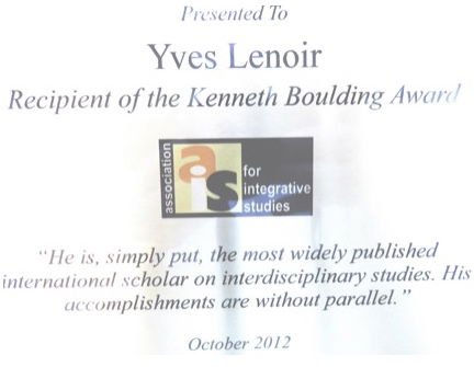 Enfin, il importe de mentionner qu’il a été le récipiendaire du Kenneth Boulding Award attribué par le comité des anciens présidents de l’Association for Interdisciplinary Studies (AIS) des États-Unis. Ce prix lui a été remis en 2012 pour ses travaux sur l’interdisciplinarité parce que « he is, simply put, the most widely published international scholar on interdisciplinary studies. His accomplishments are without parallel ». Le Pr Lenoir était le premier étranger et seulement le septième récipiendaire de ce prix qui n’avait alors été accordé que de rares autres fois au cours des 37 années d’existence de l’AIS. Enfin, plusieurs traductions de ses écrits sur l’interdisciplinarité ont été diffusées au Brésil, au Chili, en Colombie, au Mexique… et ailleurs. Les résultats de ses travaux ont été utilisés par exemple par le rapport Proulx sur les commissions scolaires confessionnelles et dans des rapports du Conseil supérieur de l’éducation. La professeure Françoise Cros du CNAM à Paris écrivait le 13 janvier 2012 à propos de ses travaux sur l’interdisciplinarité que « Les recherches d’Yves Lenoir sont très connues en France et sont souvent citées comme références allant au-delà de l’hexagone par une perspective internationale d’où le monde anglophone est souvent exclu voire oublié. Non seulement ses recherches sont connues mais il est souvent fait appel à lui dans des travaux d’expertise concernant aussi bien l’école et le monde éducatif que les milieux de formation professionnelle. Il est également sollicité dans beaucoup de colloques ou de manifestations internationales pour apporter une approche méthodologique prenant en compte à la fois la complexité et l’exigence théorique indispensables face à des objets surmédiatisés et évoqués dans le langage commun ».